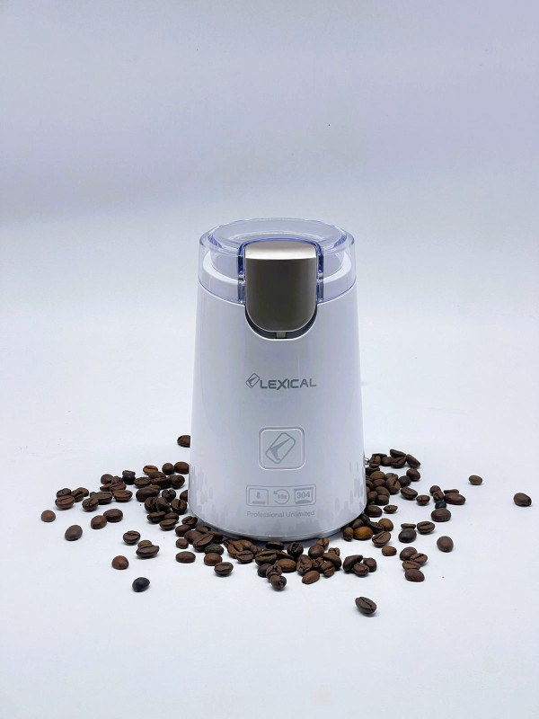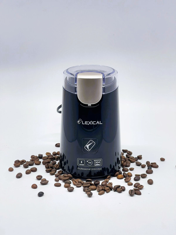 Moulin à café LEXICAL - Capacité : 60g - Puissance : 250W - Lames en acier inoxydable - Démarrage par pression sur le couvercle - Système de verrouillage sécurisé - Pieds antidérapant - Couleur : Noir - Garantie 1an